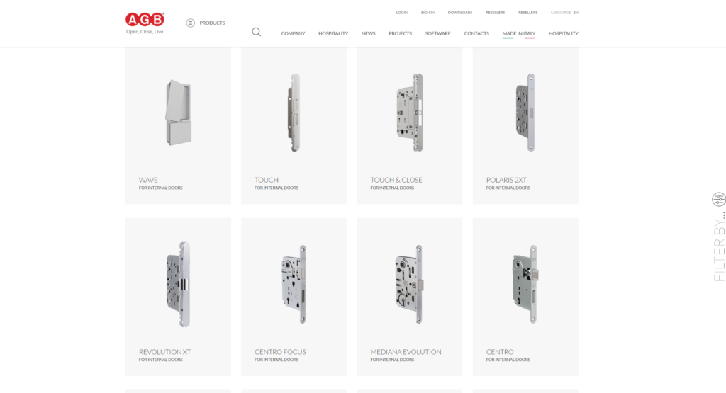 AGB offers a variety of locks suitable for “entrance doors,” “interior doors,” “sliding doors,” and “folding doors.”