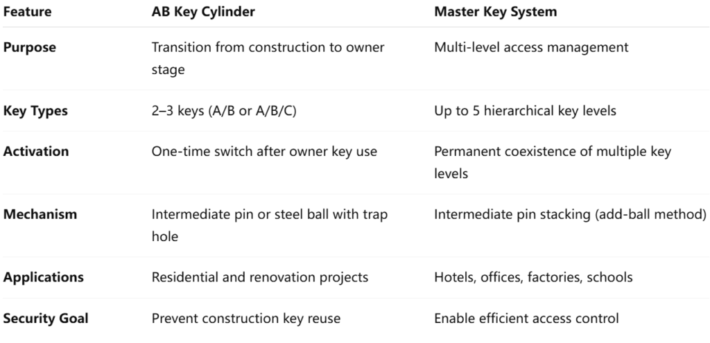 Two of the most common examples are the AB key system and the Master Key System — both designed to solve real-world challenges in property management, renovation, and large-scale building operations.