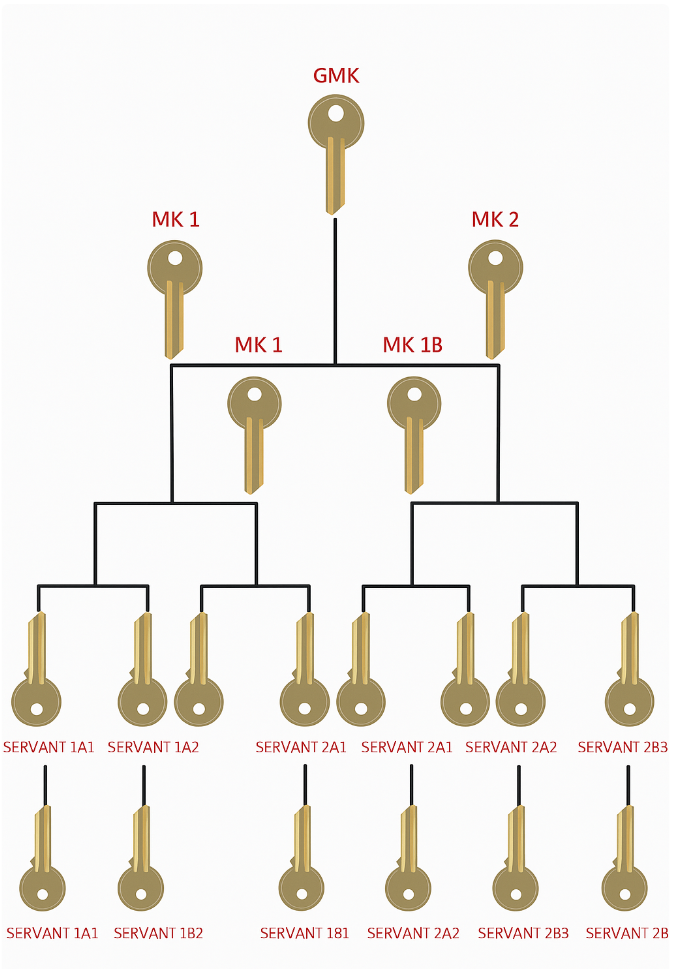 In larger facilities, a master key system can have up to five hierarchical levels, such as: