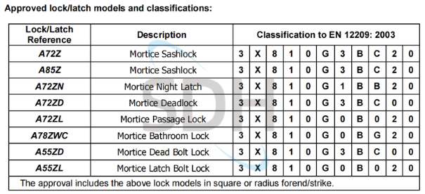 SDH’S locks are approved by Warringtonfire and Classification Code: 3 X 8 1 0 G 3 B C 2 0 according to standard EN12209:2003