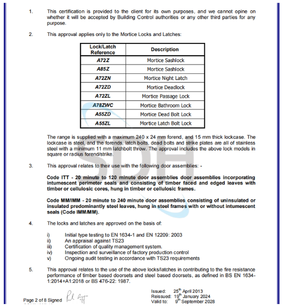 SDH mortise locks have been tested by Warringtonfire and achieve up to 240 minutes of fire resistance according to standard EN 1634-1 and EN 12209:2003.